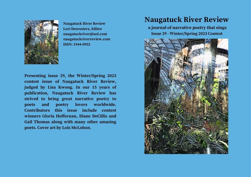 Submissions for Naugatuck River Review are temporarily closed. We open again July 1st – September 1st for the 2024 contest issue, which will be judged by Sarah Browning. Meanwhile, please order a copy of the 2023 contest issue (issue 29) for only $10. Link below!